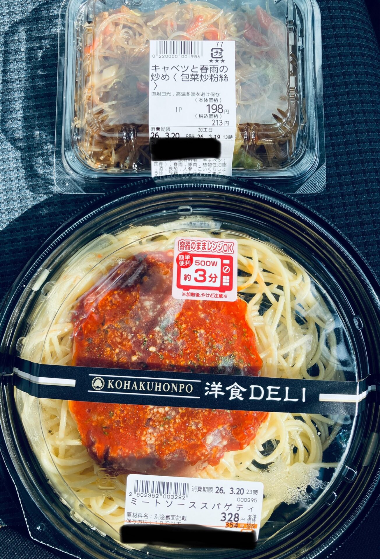 他にも「焼きそば&とりめしにぎり」や「唐揚げ弁当」などありましたが、麺の気分だったのでスパゲッティと春雨にしました。